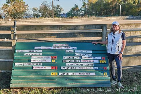 Newport Polo staff and volunteers assembled early for the final preparations, marking the arena, firing up the scoreboard, spreading banquet tables with beverages and a lunch buffet, and posting the matchups on the leaderboard around the arena as supporters gathered for the official competition to begin, and players and grooms prepared the ponies.
